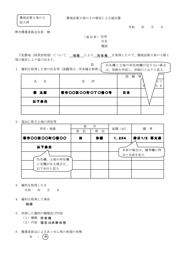 届出書には、届出者の氏名・住所、取得した農地の所在・面積、権利を取得した事由(相続など)、取得した権利の種類などを記載します。